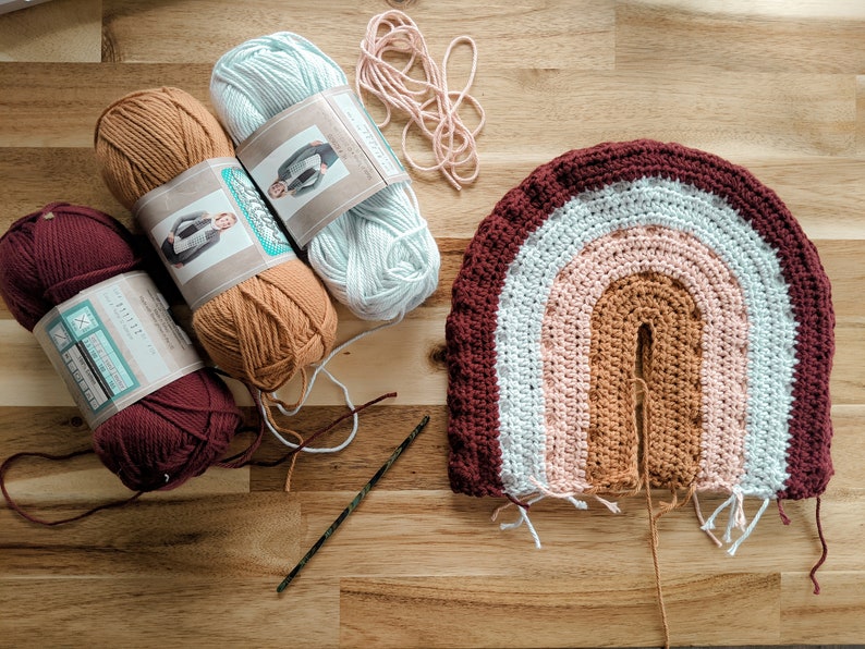 This is a great pattern to use up some of your leftover stash of yarn! Have fun with different yarn textures and sizes! Depending on the size of yarn you decide to use, this crochet pillow will differ in size slightly. A thicker yarn will result in a little bit larger rainbow, while if you use a Sport weight yarn the rainbow will be a little smaller. The same applies to needle size. The larger the needle, the larger your stitches will be and the larger the rainbow will end up. Choose what works the best for you!