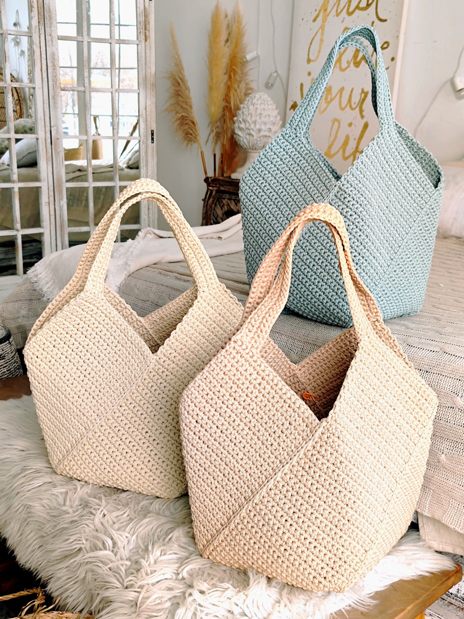 - Beach Bag 1: Perfect for your sunny days at the beach or a casual outing, this versatile crochet beach bag pattern will be your new go-to accessory. Sturdy, stylish, and spacious enough to hold all your essentials, itโs designed to be both practical and trendy. Choose your favorite colors and create a bag that matches your summer vibes!