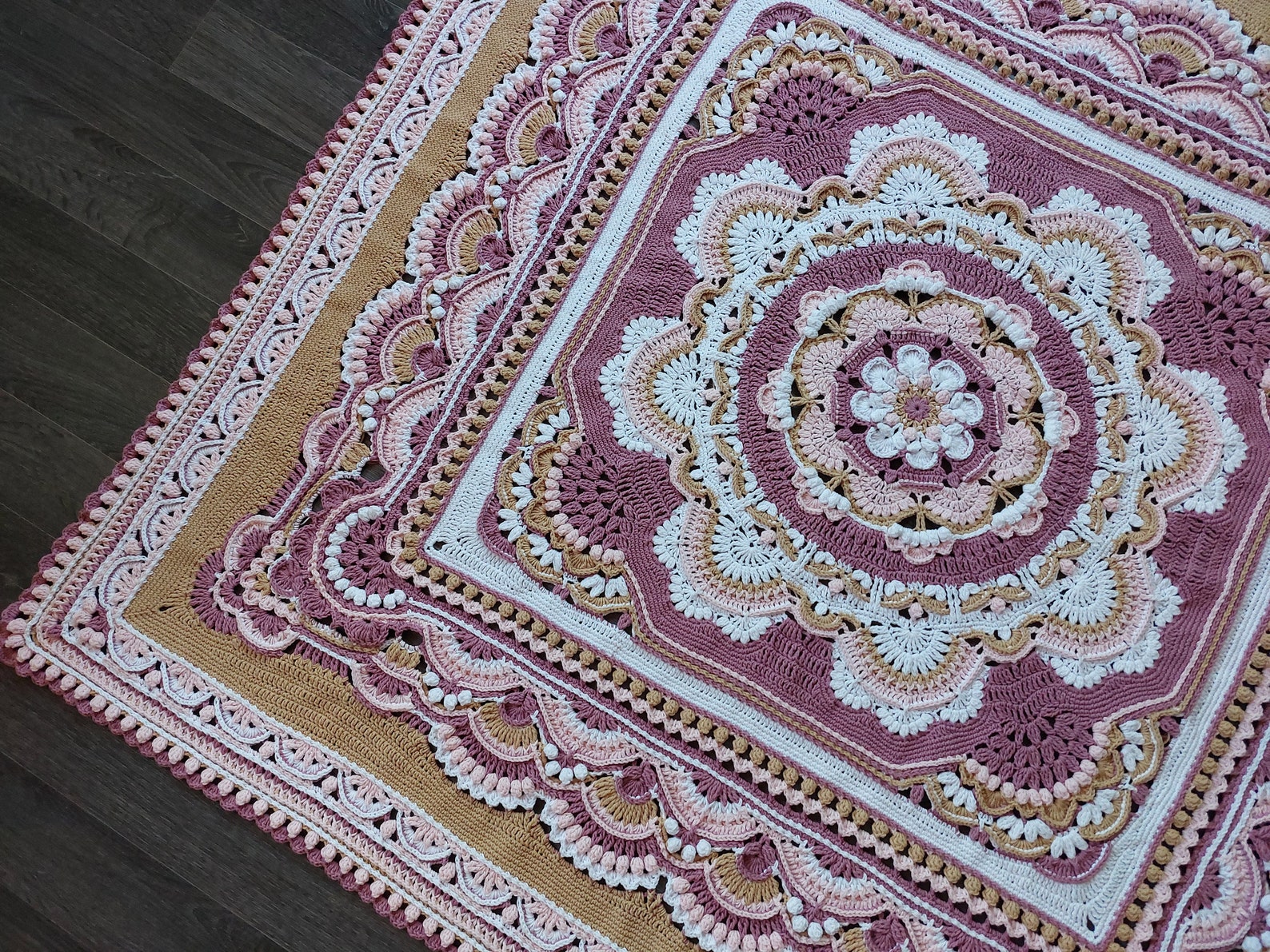 This blanket in weight 2 yarn measures 140×140 cm / 55×55 inches. Hook: 3.5 mm Amount of yarn: approx 4300 m / 4700 yds. Please note the final amount of yarn you will need depends on: a. your crochet tension, b. yarn, c. hook size